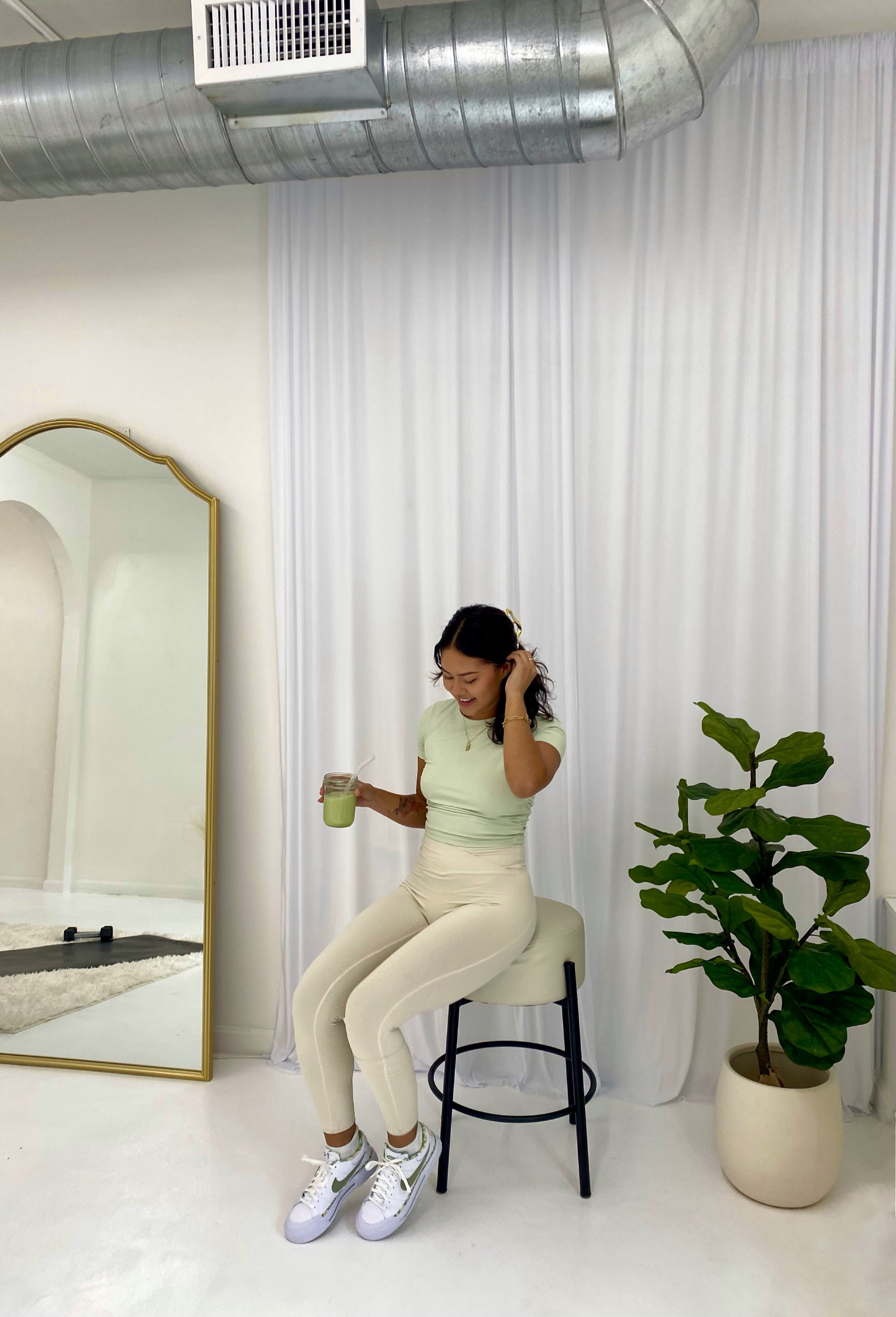 The perfect cropped tee is finally here. Made of buttery soft and stretchy material, this top is breathable but will hug you in all the right places. Ruched stitching on the side seams and a minimal logo on the back. Pairs to perfection with our evolve tights, your favorite shorts, or jeans!